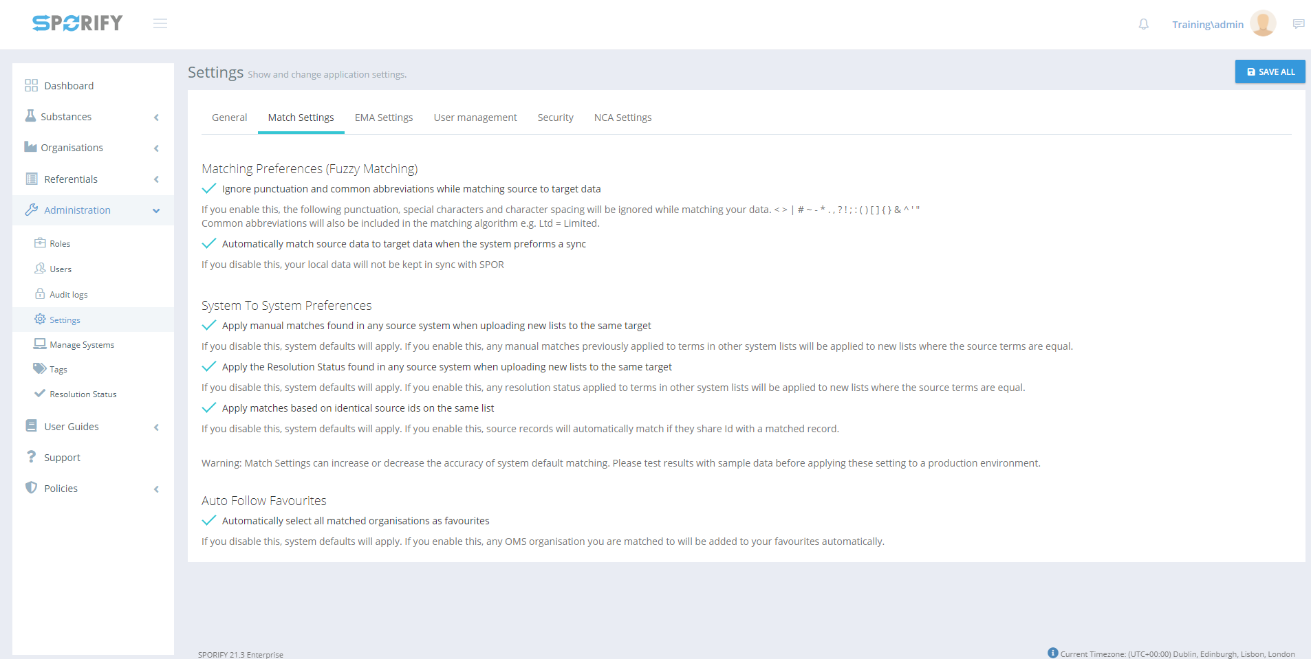 To succeed, the administrator must be able to manage their matching preferences using the Match Settings tab in SPORIFY Administration Settings.