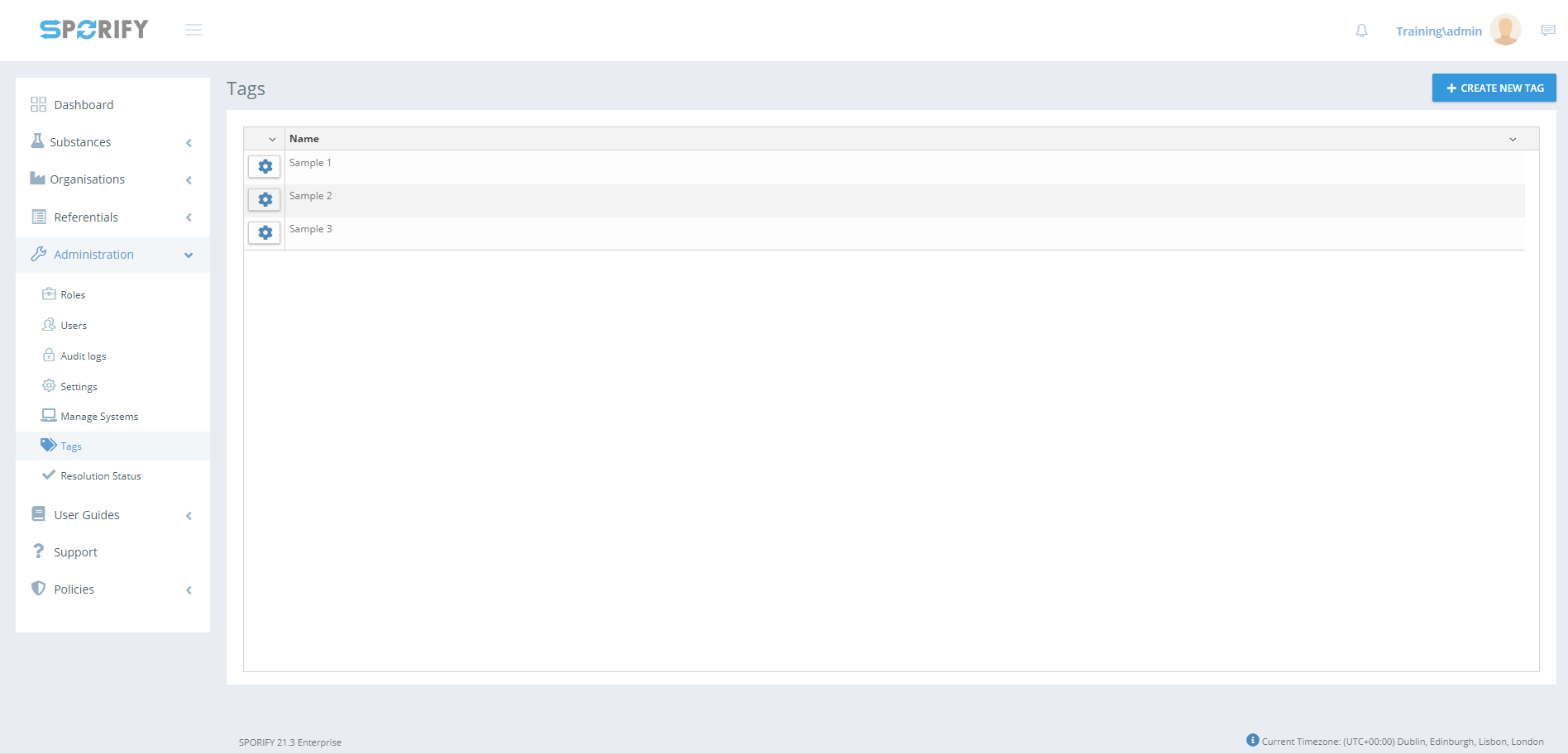 Verify that the Tags area is accessible via SPORIFY Administration Tags.