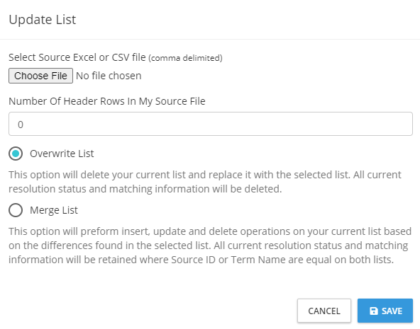 Merge List: This option will perform insert, update and delete operations on your current list based on the differences found in the selected list. All current resolution status and matching information will be retained where Source ID or Term Name are equal on both lists.