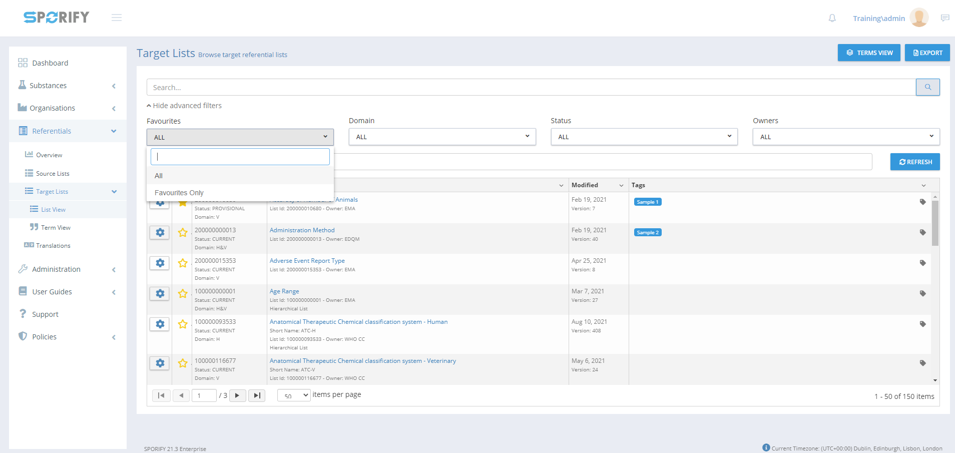The SPORIFY user can search and filter Referentials Target Lists using the Referentials Target Lists grid screen.