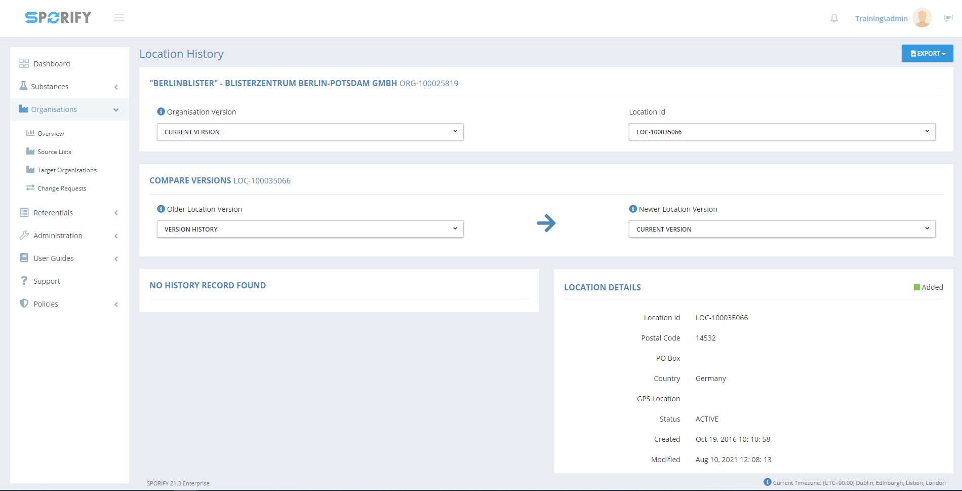 The purpose of these GUI elements is to present the differences between different historical versions of Organisations and Locations.