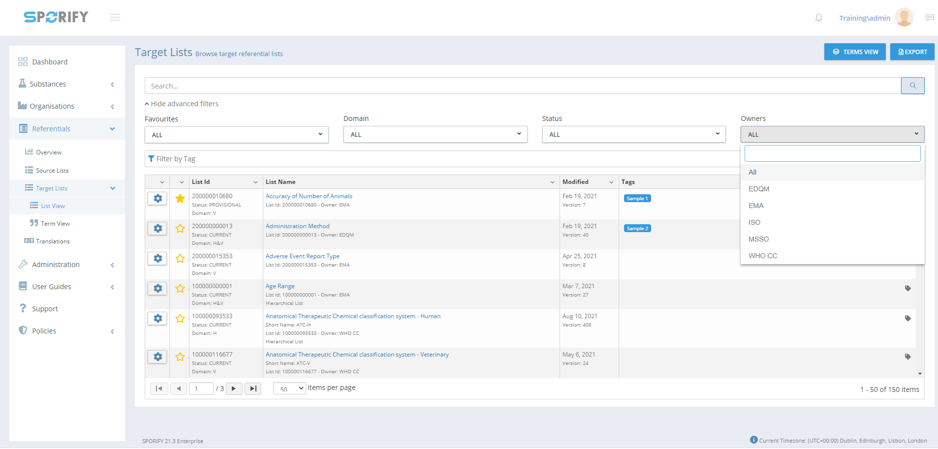 The SPORIFY user can search and filter Referentials Target Lists using the Referentials Target Lists grid screen.